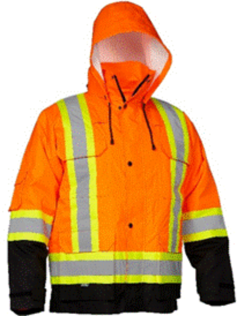 3 piece snap off hood. Upper arm pen and tool pocket. Drop back hem.